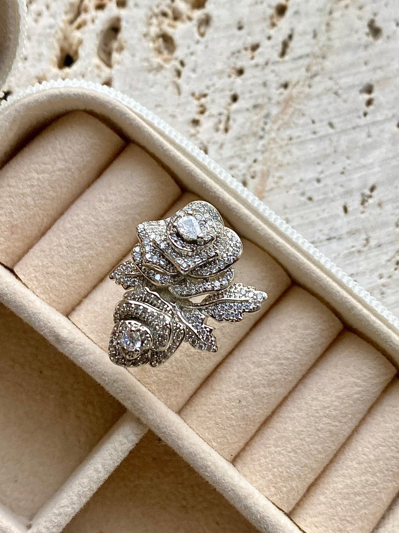 Silver rose-shaped ring with gemstones in a beige jewelry box
