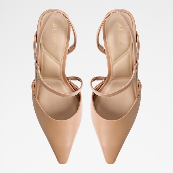 Pair of beige high-heeled shoes with thin straps on a light gray background