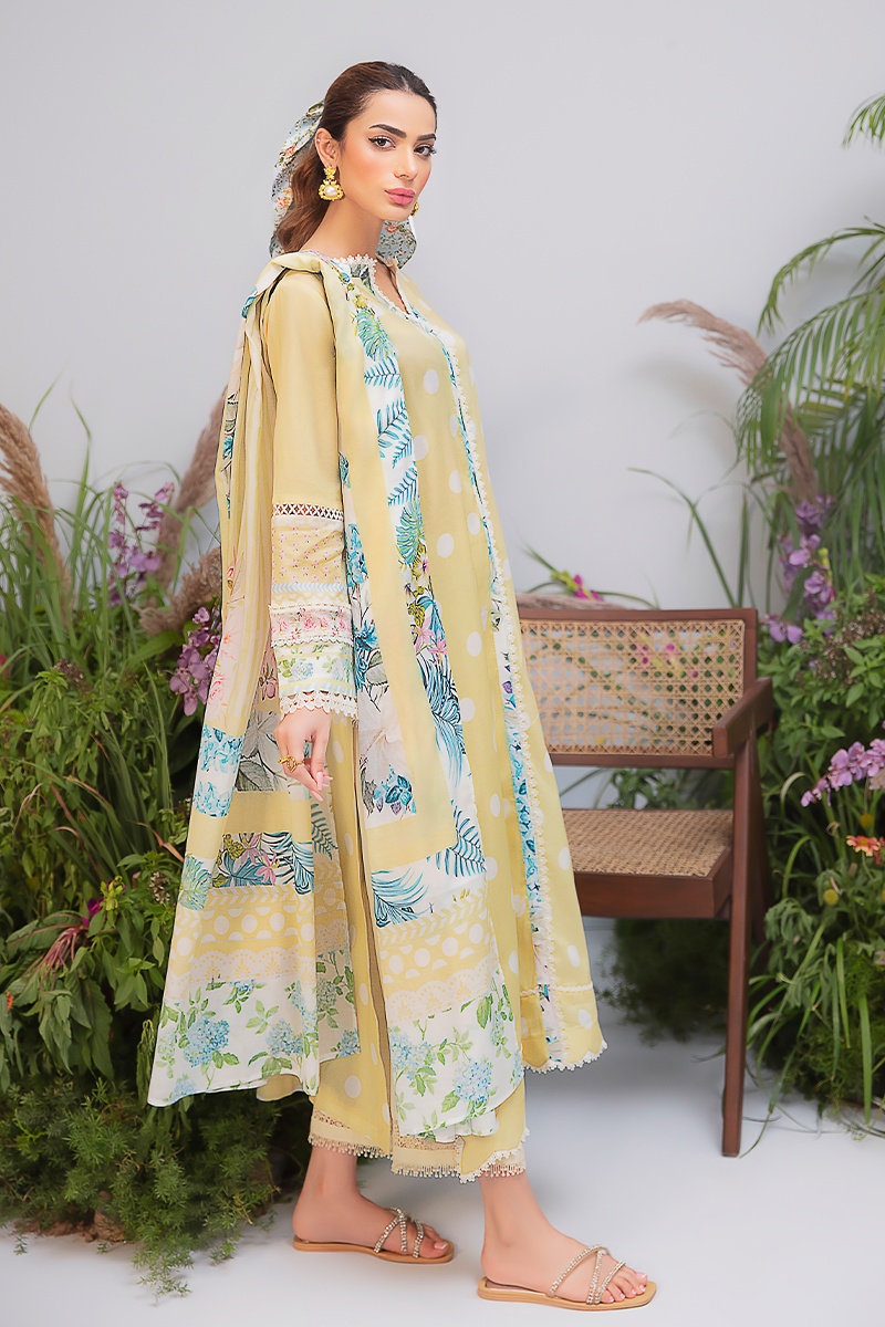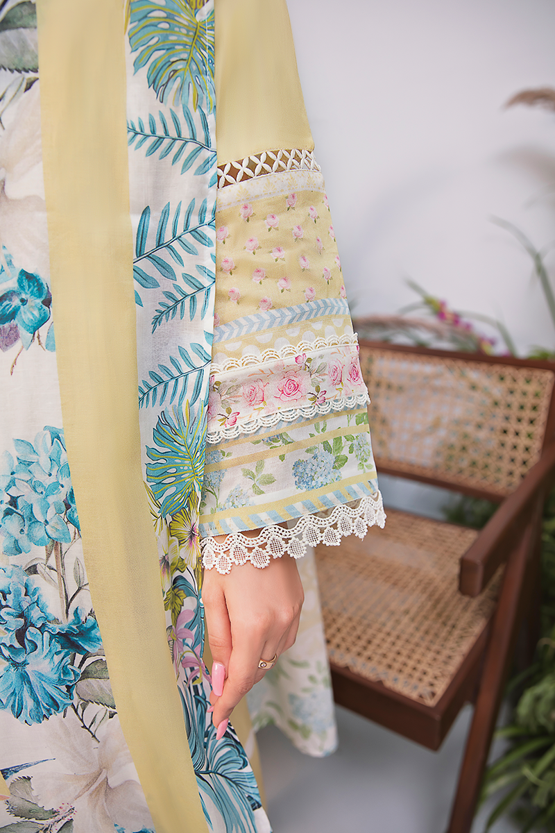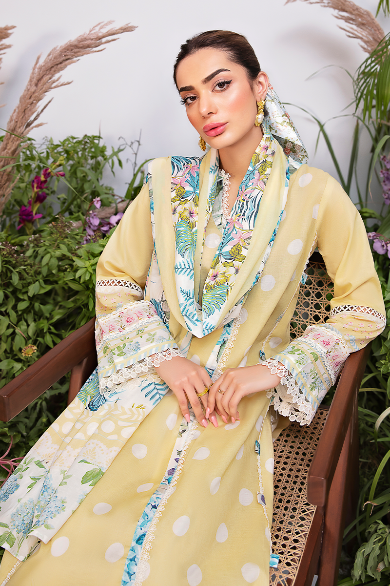 Nazli looks stunning in a gentle pale yellow with white polka dots. The outfit features an alluring front-open cut line with delicate lace details and subtle blue accents, while the ensemble is beautifully complemented by a dupatta adorned with blue leaves and pink florals.